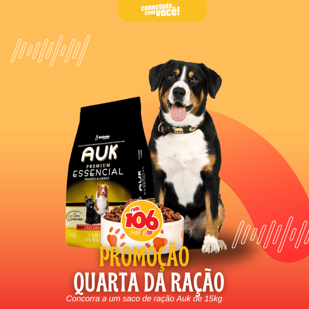 Pensando no seu animalzinho, a Rádio 106 FM e a Agropecuária Racho Alegre vão te presentear com um saco de ração Auk de 15kg